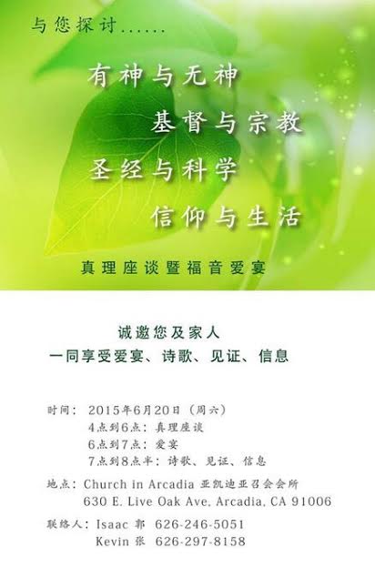 如果您愿意来看看基督徒有神的爱和生命的生活,请6/20/2015 ( 周六) 下午4:00AM 参加南加州福音生活座谈会。